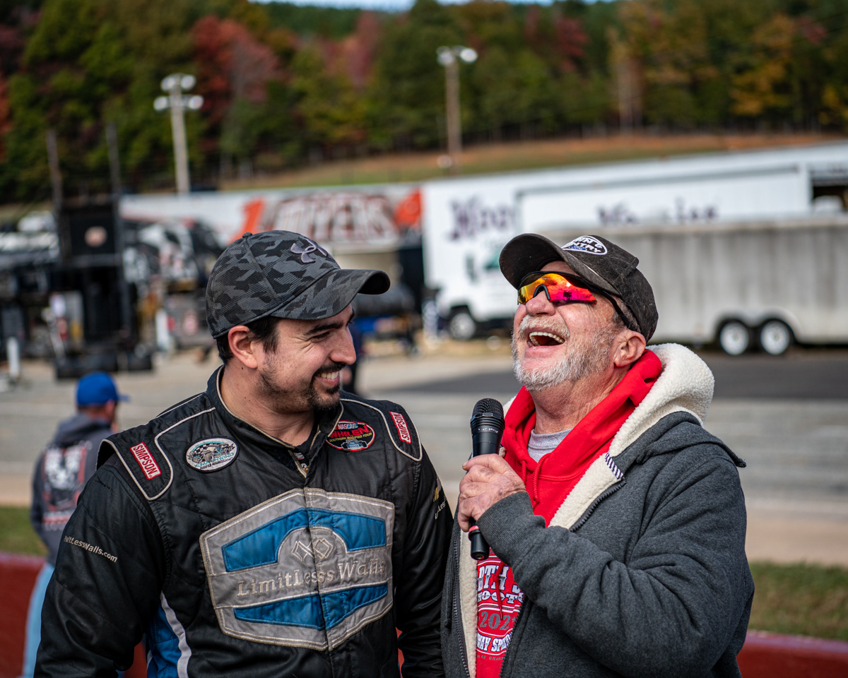 Gary Puttnam celebrates his victory in the SMART Modified 99 Lap race at Caraway Speedway during the Rusty Harpe Memorial in Sophia, N.C. on July 3, 2021.